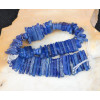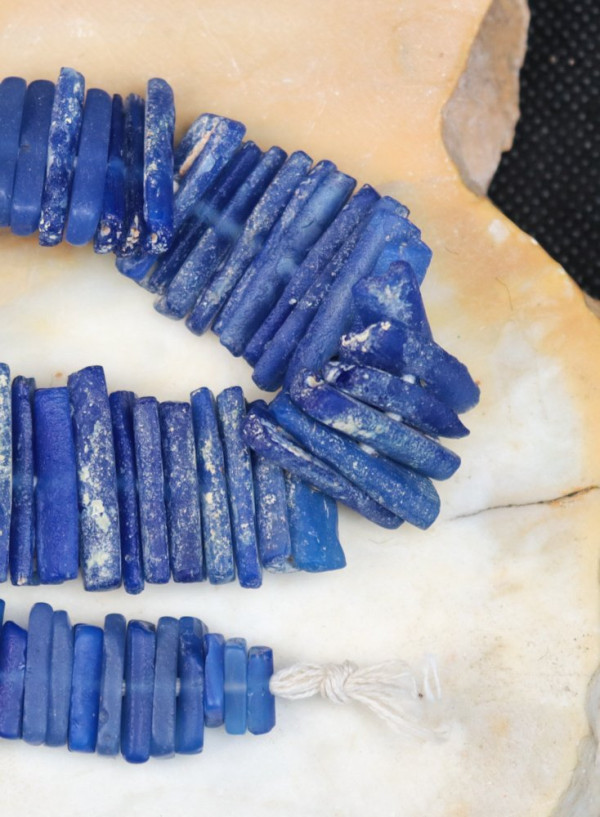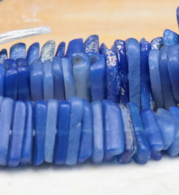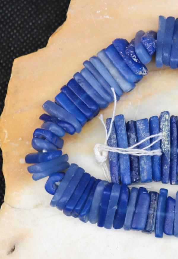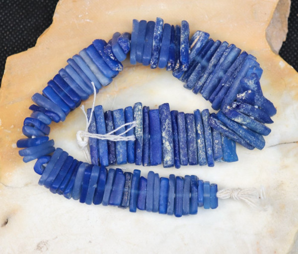 Very rare beads obtained by cutting cylindrical beads in half lengthwise. Length of strand = 25cm; weight = 66g; thickness = 2-4mm; length = 9-24mm.
