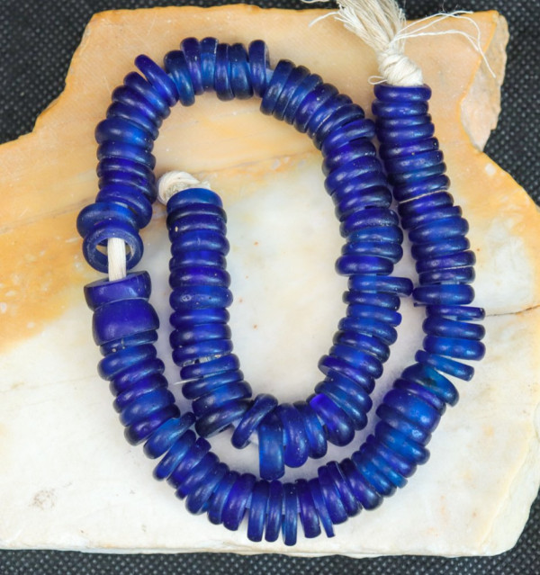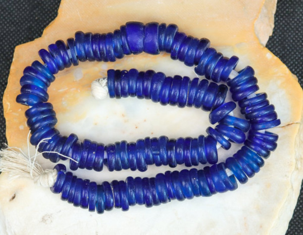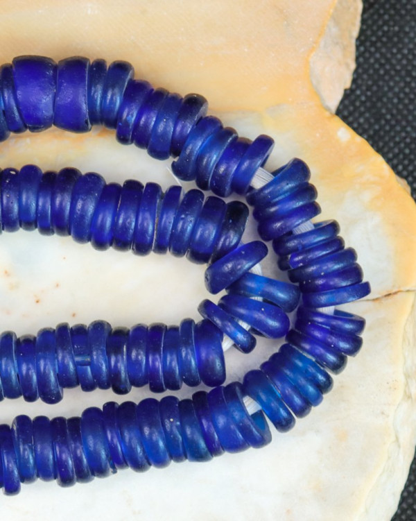 The glass beads were manufactured in the Netherlands and their production stopped around the year 1900. They are thus very ancient. They used to be called « dutch donuts » by the merchants who exchanged them in Africa for ivory, gold, oil…